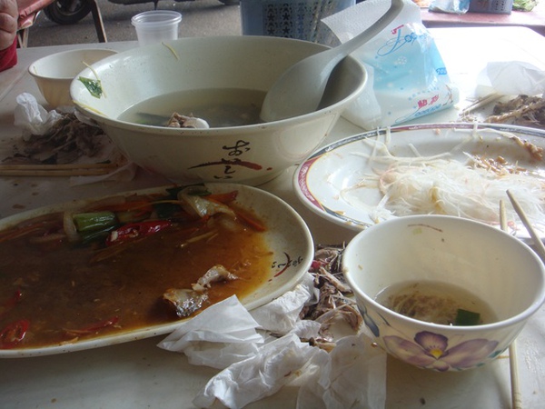 因為搭船回來巳近中午,隨便在港口旁找家店面吃,結果沒去美食攤.反而去旁邊在賣漁貨的”路邊攤”的後方隨意搭起桌子來吃.